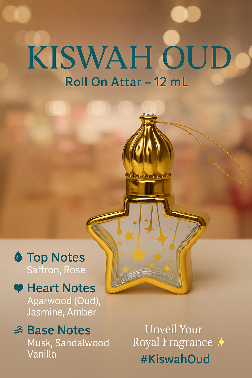 Deep oud, blooming jasmine, and smooth sandalwood intertwine, capturing the essence of tranquil nights and whispered secrets, wrapped in a luxurious, timeless scent.