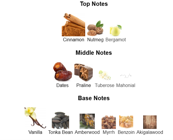 Khamrah by Lattafa Perfumes is a Oriental Spicy fragrance for women and men. Top notes are Cinnamon, Nutmeg and Bergamot; middle notes are Dates, Praline, Tuberose and Mahonial; base notes are Vanilla, Tonka Bean, Amberwood, Myrrh, Benzoin and Akigalawood.